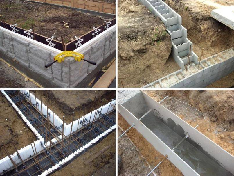 К сборке опалубочной конструкции приступают после того, как выкопаны траншеи для фундамента и выполнена укладка песчаной подушки. Наиболее распространен вариант установки съемной щитовой опалубки из плит OSB. Сборно — щитовые опалубочные конструкции легче установить по размерам фундамента и провести коррекцию углов.