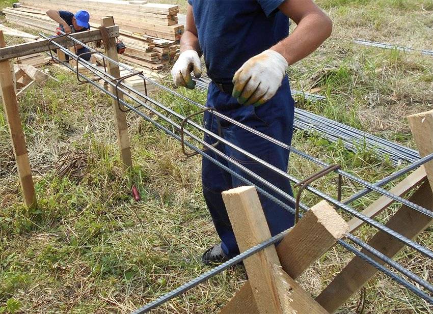 - В каждую скважину установить по 6-8 прутков, объединенных проволокой, и усиленных поперечной арматурой. Они должны располагаться не менее чем в 2 см от края лунки и быть длиннее скважины, чтобы связать их с ростверком.