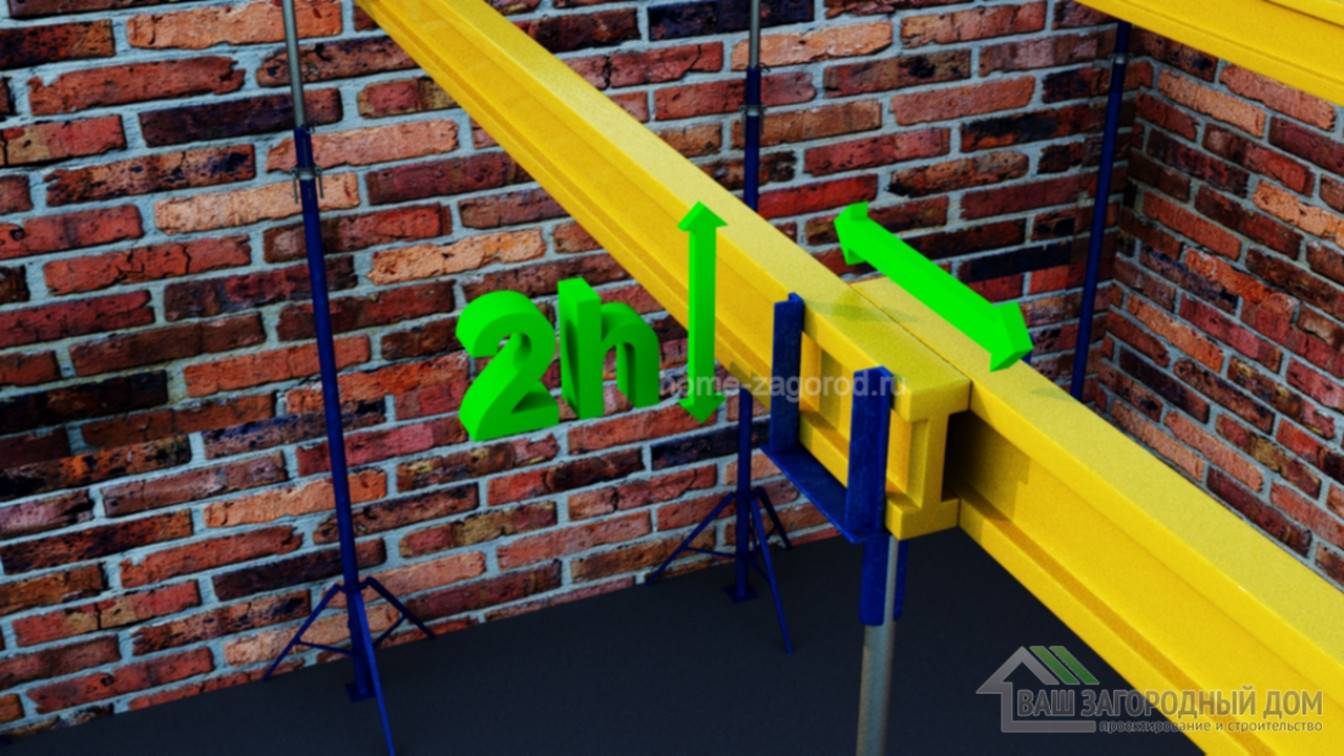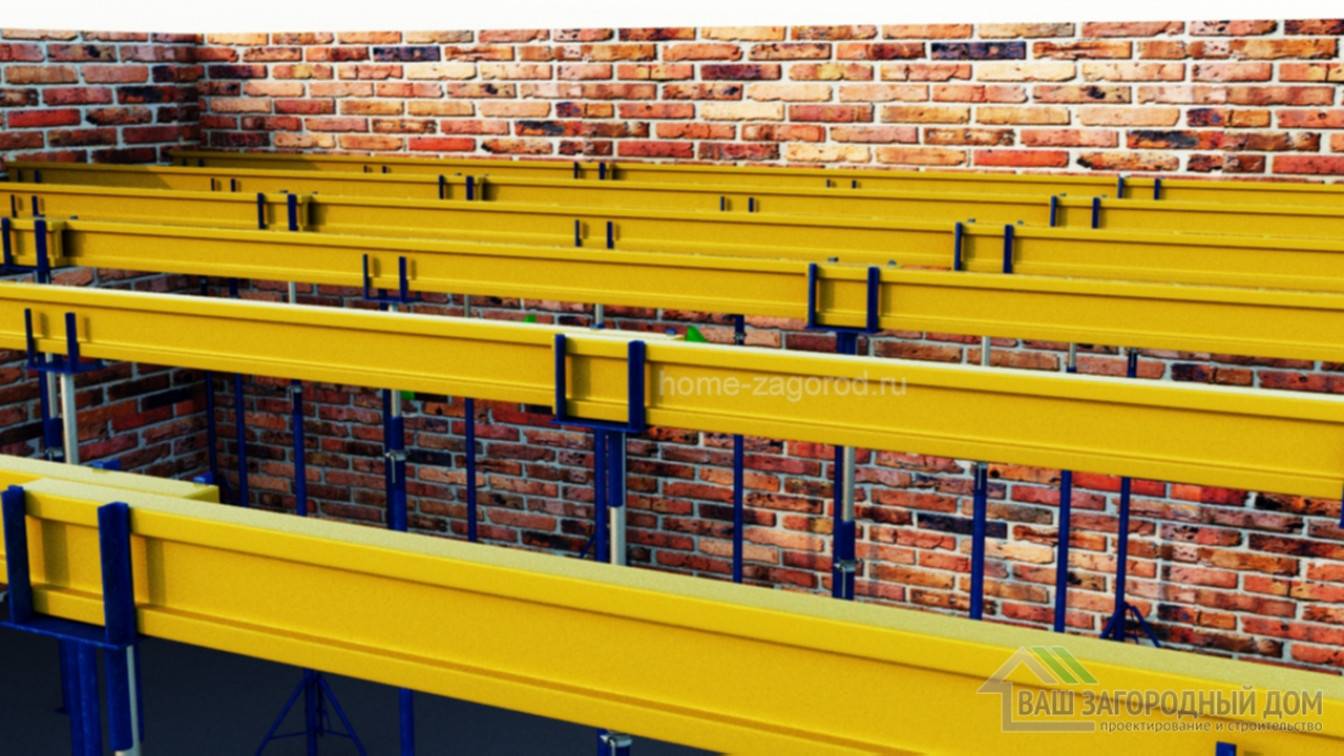 Раскладываются первичные балки с нахлестом друг на друга, если это необходимо, нахлест составляет не менее 2h, то есть две высоты самой балки. Под все нахлесты ставим также стойки.