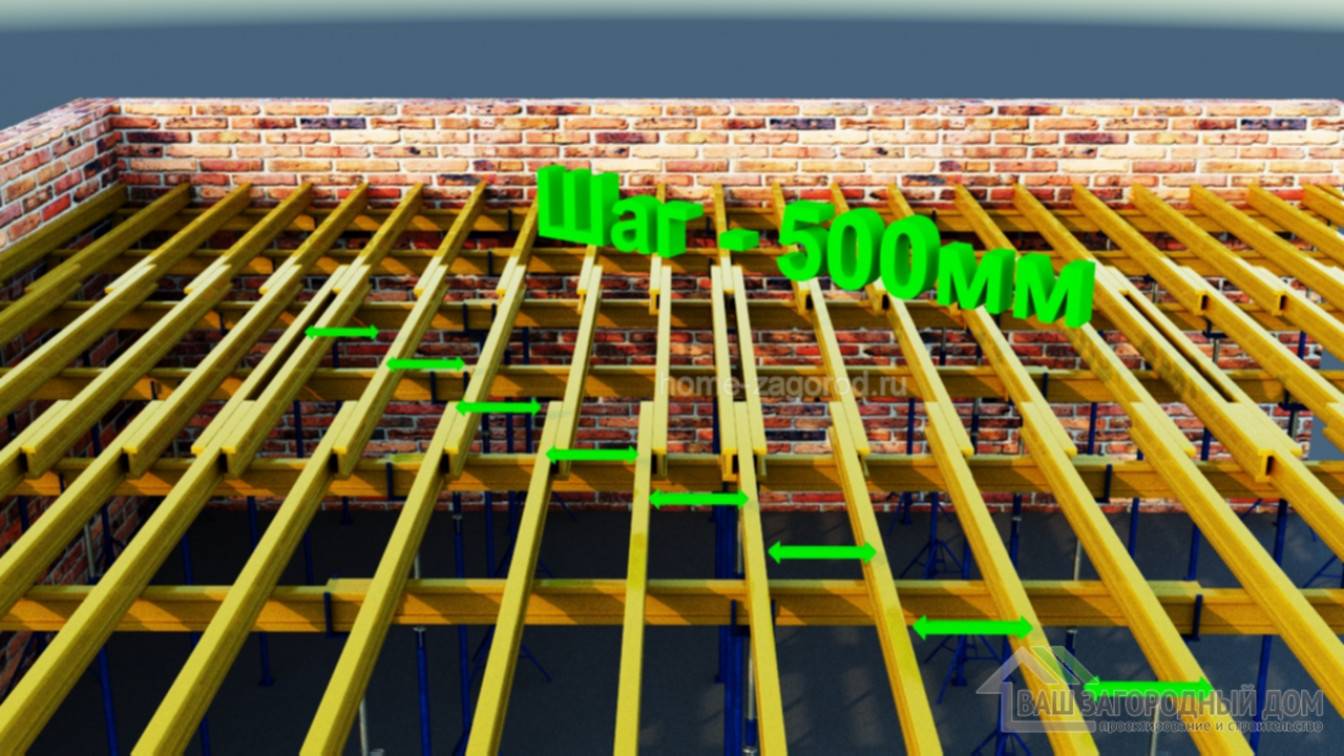 Далее раскладываем вторичные балки поперек первичных балок с шагом 500 мм, данный шаг делается при толщине плиты указной выше.