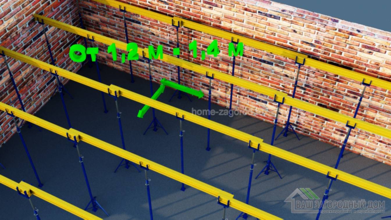 Далее выставляем телескопические стойки под первичные балки они выставляют по краю вдоль стен с шагом от 1.2 – 1.4 метра.