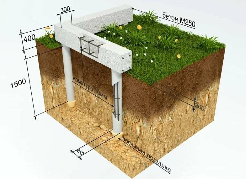 Столбы формируют из труб, которые плотно вгоняют в грунт и заполняют бетоном. Для распределения постоянной и временной нагрузки на все столбы равномерно, их связывают ростверком. Надежная конструкция ростверка снижает риск опрокидывания строения из-за пучения грунта.