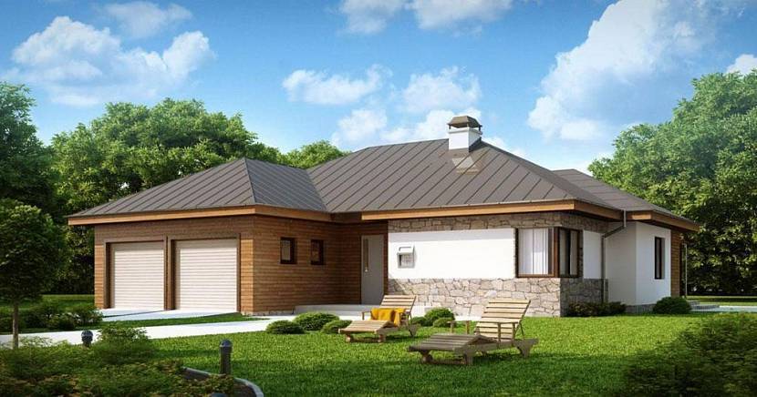 Одноэтажный проект дома 150 м2 с фронтальным гаражом на 2 машиныИсточник tornhouse.ru