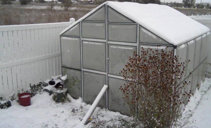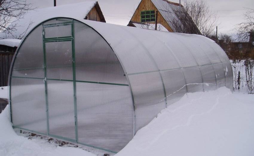 Сориентирована она должна быть с севера на юг, крышу лучше всего сделать двускатной, а под коньком крыши установить дополнительные опоры, чтобы конструкция не рухнула под тяжестью снега. Если каркас фабричный и теплица в сечении имеет форму арки, это ещё лучше – снег будет сам сползать.