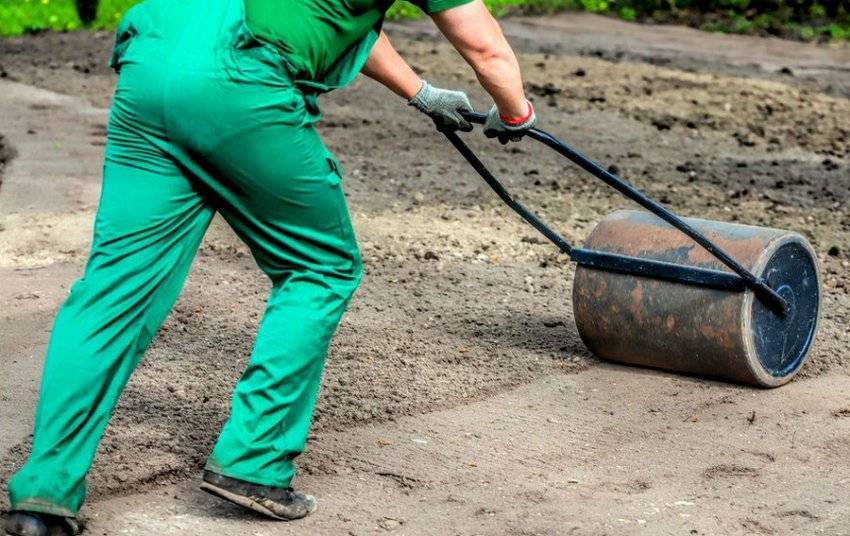 Будет гораздо удобнее, если к доске прибить черенок от лопаты, и перетаскивать доску наподобие граблей. Или же можно использовать садовый (газонный) каток. В итоге поверхность земли должна быть ровной, без каких-либо впадин или возвышенностей, бугров.