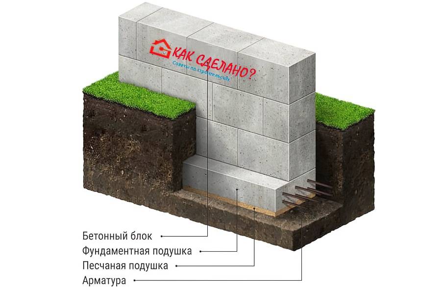 Из этих блоков может строиться фундамент любого типа. Классический вариант — ленточный мелкозаглубленный фундамент.