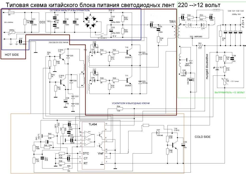 Когда была обнаружен причина поломки, то можно начинать ремонт. Чтобы обойтись для этого своими руками, нужна схема работы преобразователя. В БП, предназначенных для подключения светодиодных лент, часто используется типовая схема.