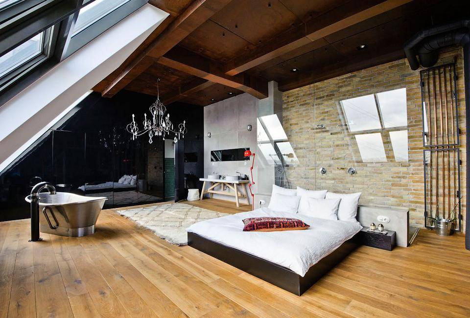 В спальне в стиле лофт можно экспериментировать с цветом, фактурой и дизайном. Чтобы создать иллюзию объединенного открытого пространства, в спальне можно создать небольшую гардеробную, отделенную большими стеклянными дверями.