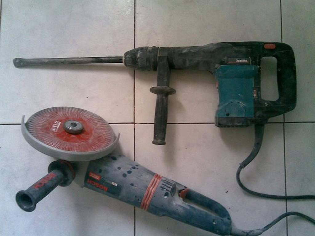 - Болгарку. С ее помощью вырезают участки штукатурки или режут покрытие на более мелкие части, подготавливая их для отбивания зубилом или перфоратором.
