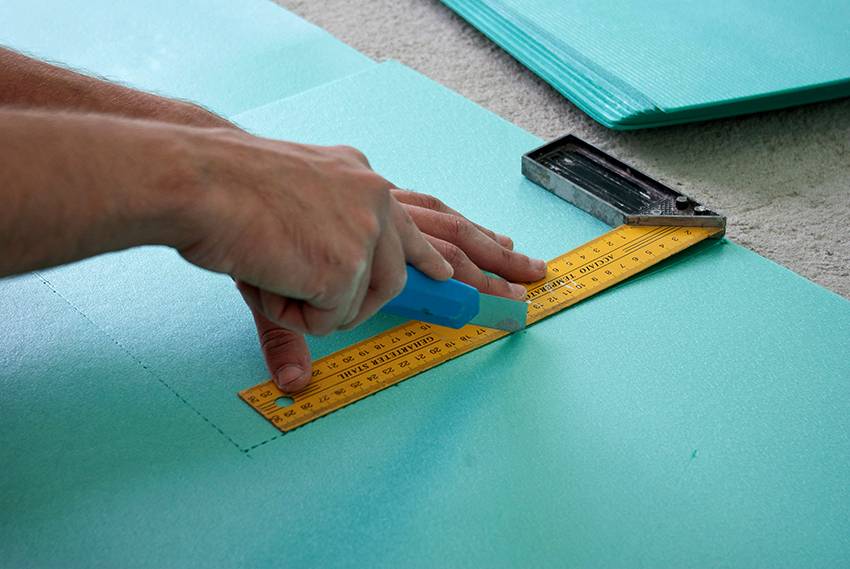 - Если же вы используете рулонную вариацию подложки, то раскатайте ее от стены до стены, обрезая впритык. Параллельные полосы материала также соединяйте при помощи строительного скотча.