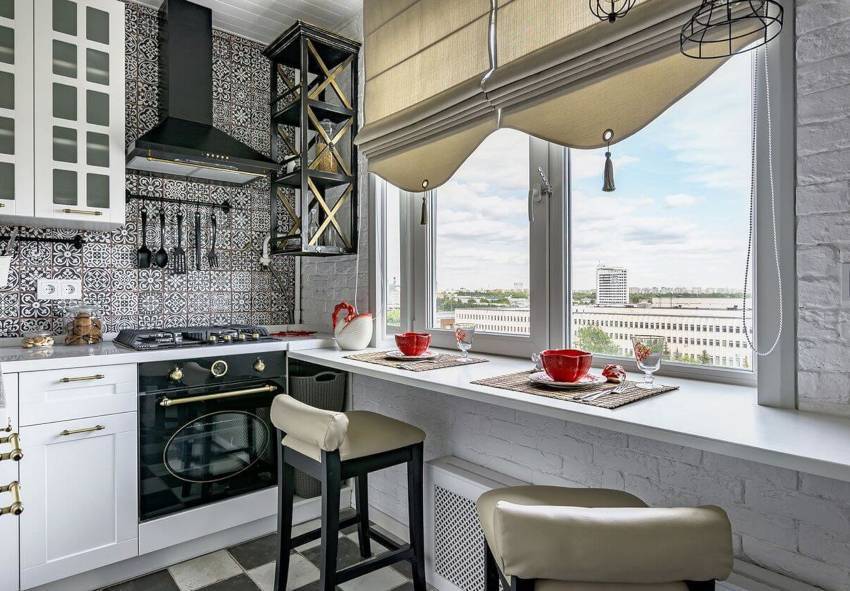 Для небольших или узких кухонь оптимальным решением будет превратить подоконник в обеденный стол. Столешницу можно сделать раскладной – часть будет опускаться вниз или подниматься на подоконник. Конструкция может быть угловой, став продолжением кухонного гарнитура. Для кухни-студии выгодным вариантом будет трансформация подоконника в барную стойку.