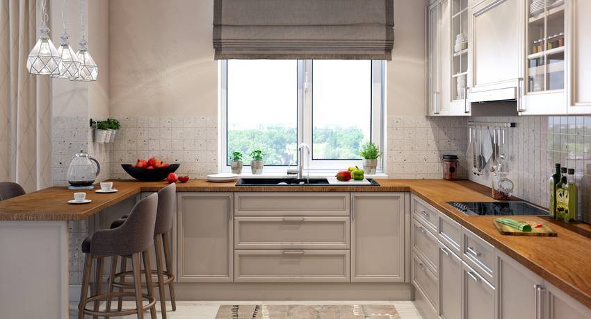 3. При оформлении окна практичнее отказаться от тканевых занавесок и отдать предпочтение рулонным шторам или жалюзи. 4. Материал и цвет столешницы должны гармонировать с уже имеющимся гарнитуром и с общим видом кухни.