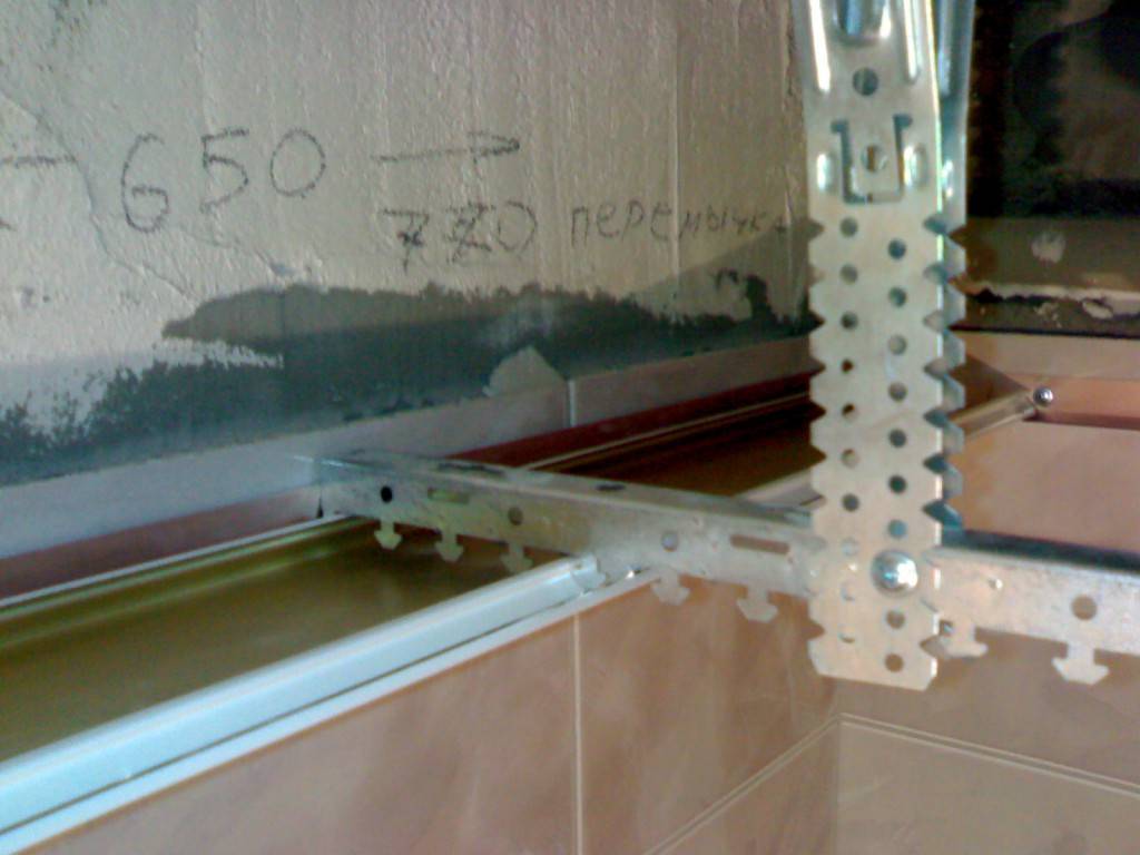 - Фиксируют металлические направляющие на стенах с помощью саморезов.