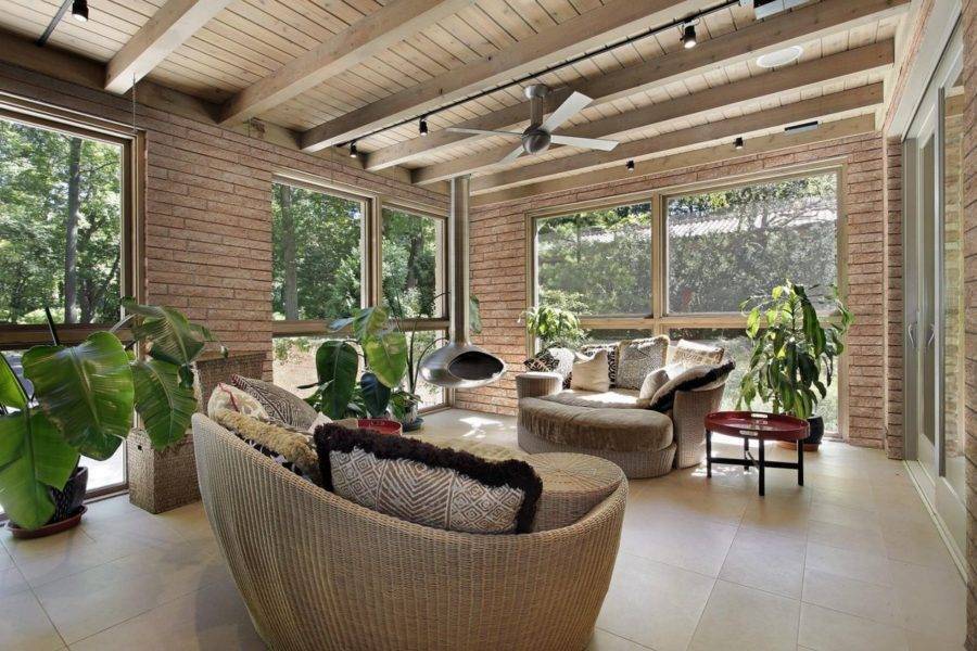 Веранду необходимо визуально сделать высокой. Помогут в этом большие окна или панорамное остекление в пол.