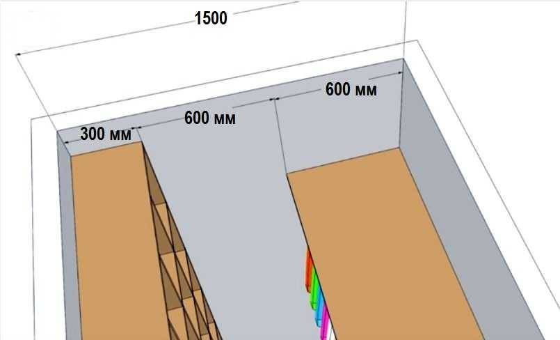 - Приведенные на схеме ниже размеры также могут быть подвергнуты корректировке. На данном этапе необходимо прикрепить металлические профили к стене, полу и потолку кладовки. Каркас конструкции начинает вырисовываться.