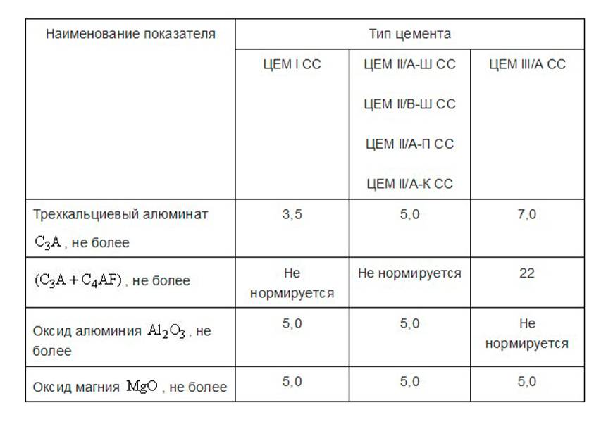 Для того чтобы придать портландцементу сульфатостойкие свойства, ему на стадии производства задают определённый минералогический состав. В маркировке добавляются две буквы С, что означает сульфатостойкий. Таблица регулирования содержания минералов в клинкере взята из ГОСТа 22266 – 2013.