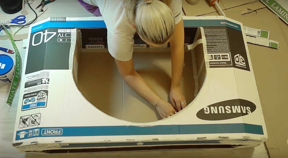 Картон разрезаем, все места, где есть разрезы, необходимо заклеить строительным скотчем. Стоит отметить, что лучше всего использовать именно строительный скотч, ведь он такой же липкий, как и обычный, но сделан на тканевой основе и на него будет лучше ложиться шпаклевка. После того, как основная коробка склеена, можно приступать к сбору дополнительных боков, их нужно согнуть немного углом, для того, чтобы готовое изделие выглядело более естественно и натурально, приклейте дополнительные картонки с обеих сторон.