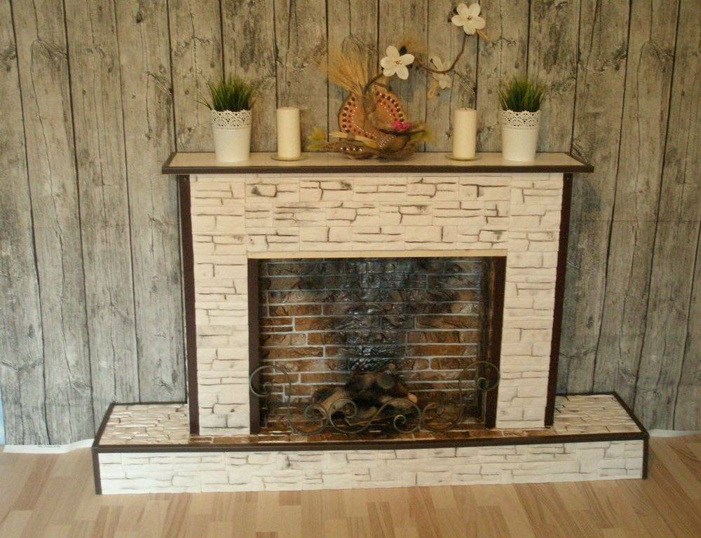 Декорацию камина можно произвести специальными пластиковыми панелями, на которых изображена имитация кирпичной кладки. Пластиковые панели имеют должный рельеф, они просты в монтаже и выглядят очень достойно.