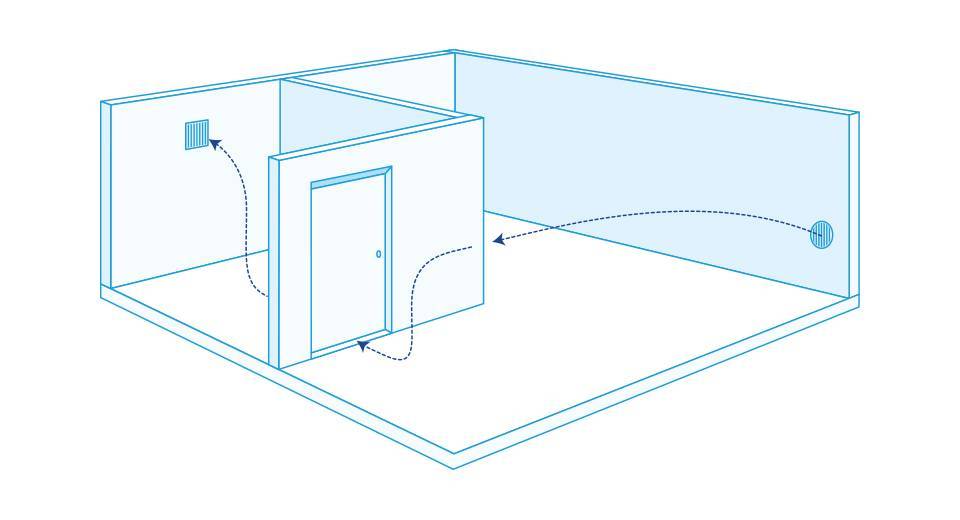 При оснащении помещения устройствами естественной вентиляции необходимо продумать вход и выход воздуха и устанавливать вытяжные клапаны напротив приточных. Это позволит создать движение воздушной среды без нежелательных сквозняков.