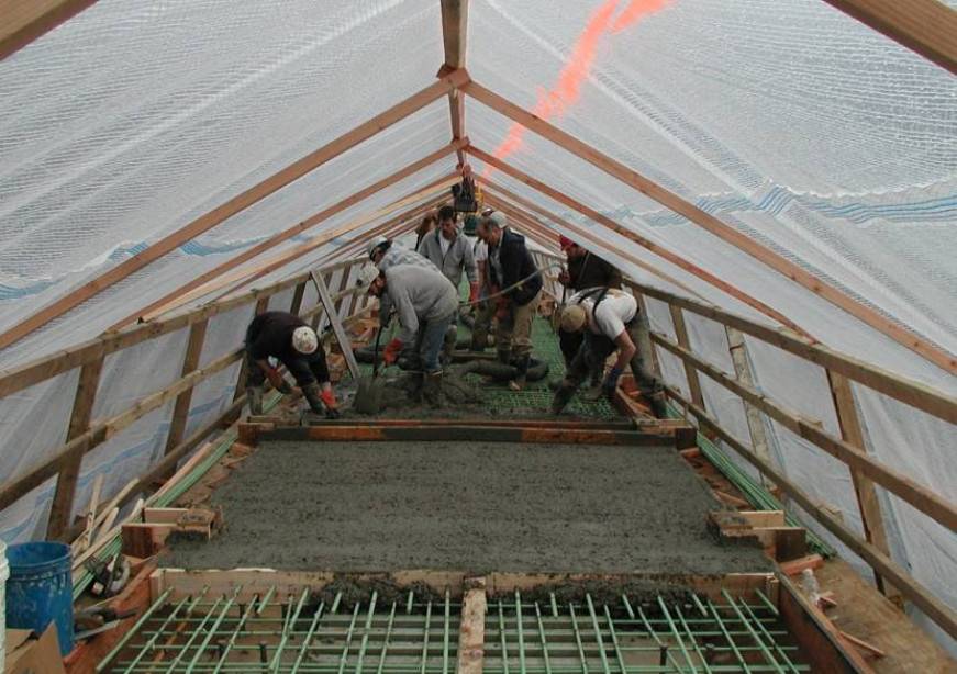 Разбираясь, при какой температуре можно заливать бетон на улице, специалисты отмечают, что ее можно искусственно увеличить конкретно над фундаментом. При небольших размерах последнего над ним можно устроить небольшие теплицы – закрытые пространства, в которые подается теплый воздух от печи или нагревателя.