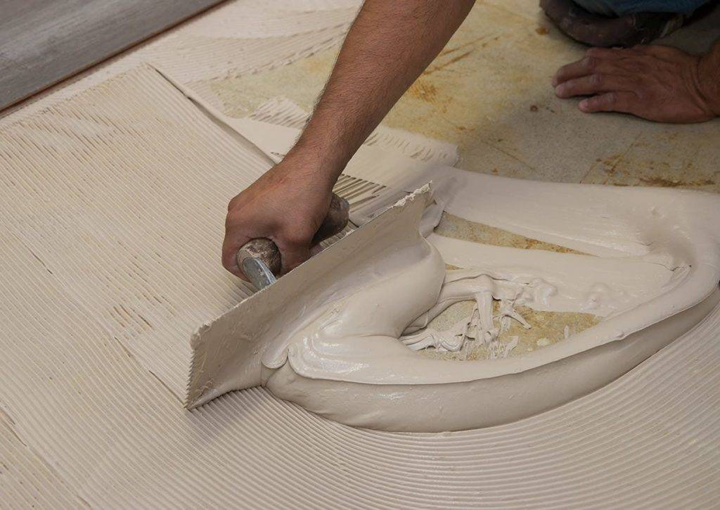 - Подготовленный плиточный клей наносится на основание гладким шпателем, а затем распределяется по всей поверхности специальными зубчатыми шпателями.