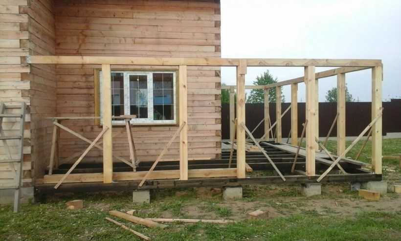 веранда должна равномерно опираться на фундамент, для этого важно разместить все опоры на одном уровне, чтобы защитить их от влаги воспользуйтесь битумной мастикой и рулонным гидроизолятором.