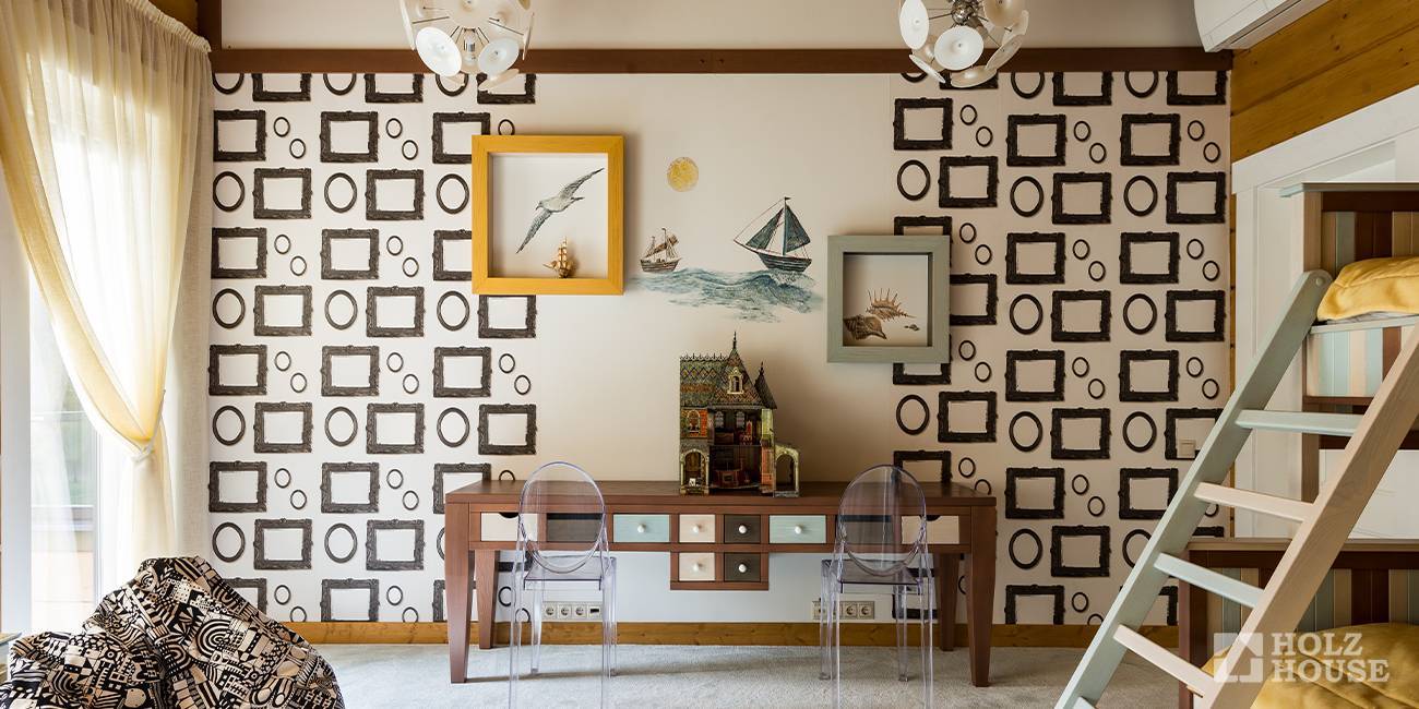 Клееный брус как экологически чистый материал, не вызывающий аллергических реакций и способствующий нужному микроклимату, идеально подходит для обустройства детской комнаты. Необычно и уютно будет выглядеть детская комната в мансардном этаже со скошенным потолком. Мебель можно также сделать из дерева, а сам интерьер разнообразить ярким текстилем и предметами декора.