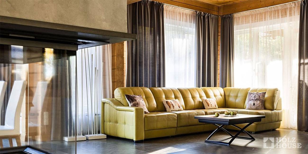 Гостиную в проектах загородных домов из клееного бруса часто объединяют с кухней и столовой. В таких случаях следует подчеркнуть единство общей зоны одним стилем в дизайне. Гостиная – это место, где домочадцы проводят время вместе, отдыхают, устраивают праздники и принимают гостей