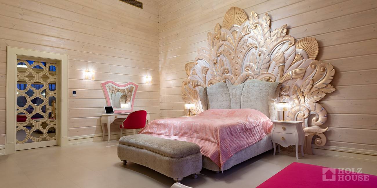 Природные материалы в обустройстве спален в доме из клееного бруса делают помещения уютными. Очень часто спальни размещают в мансардном этаже, где скошенный потолок, выполненный из дерева, можно интересно обыграть в дизайне. Такое архитектурное решение смотрится в спальне оригинально и стильно, создавая обстановку домашнего тепла и уединенности. Стены из бруса можно покрыть красками пастельных тонов, а в интерьере использовать насыщенные цветовые акценты в виде подушек, ковров, штор и так далее. Желательно размещать несколько источников света, чтобы можно было использовать как яркое освещение, так и приглушенное.