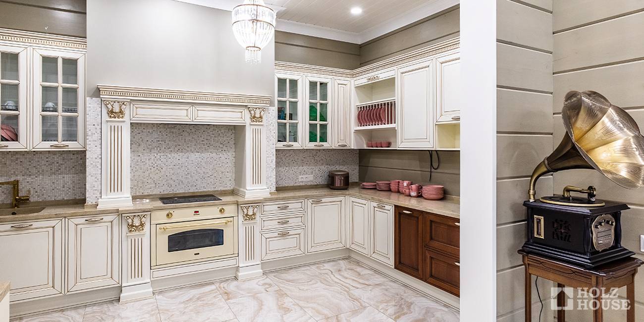 В оформлении интерьера кухни самое главное – удобно распределить зоны с учетом площади помещения. Рабочую зону и мойку лучше расположить у окна. Если габариты кухни позволяют, можно установить в центре «остров» в качестве рабочей зоны. Важную роль в интерьере кухни играет освещение: кухня должна быть достаточно светлой за счет окон и удобно расположенных светильников. Чтобы деревянные поверхности в помещении прослужили как можно дольше, необходимо покрыть их специальными составами или лаком. В области рабочих зон и раковины делают «фартук», чтобы защитить поверхность стен из клееного бруса от повреждений. В качестве элементов декора в кухне часто используют керамику, фарфор и текстиль – они удачно подчеркивают фактуру дерева и преображают интерьер кухни
