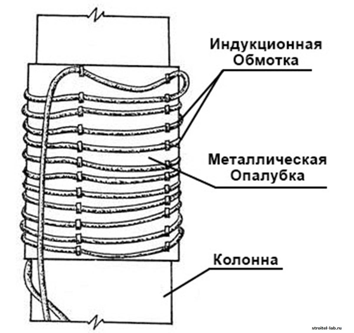 Греть способом магнитной индукции можно только армированные конструкции. Металлические элементы в этом случае оказываются незаменимыми, поскольку выполняют функцию сердечника. Вокруг залитой бетоном конструкции петлями помещают кабель в изоляции. Он будет играть функцию индуктора. Какой провод использовать, и сколько его потребуется, определяют посредством расчетов. Затем по кабелю пускают переменный ток. Образующееся в результате описанных манипуляций магнитное поле нагревает арматуру железобетонной конструкции, от которой тепло расходится по всему бетонному составу. И зима больше не является препятствием для продолжения строительных работ.