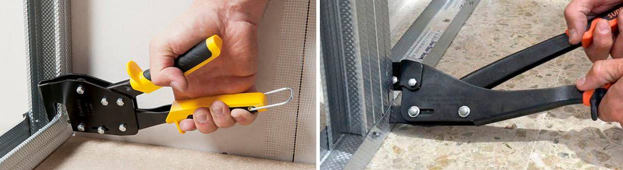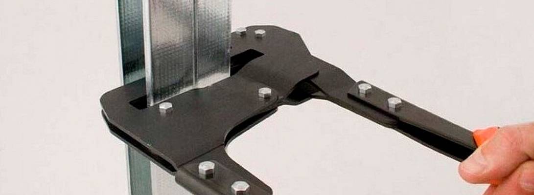 Клещами также соединяют профиля обрешетки для плит ГКЛ. Этот инструмент для соединения профилей для гипсокартона может использоваться для скрепления изделий с изгибом, без дополнительных метизов. Стандартное расстояние между просечками – 5 мм. В отличие от заклепочного соединения, поверхность металла остается ровной.