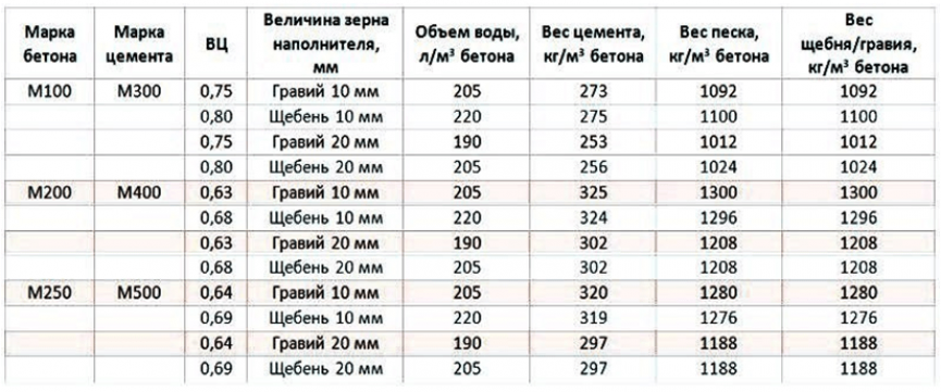 Марка полученного бетона зависит от пропорций компонентов, рецептуры распространенных смесей приведены в таблице (указано соотношение основных ингредиентов).