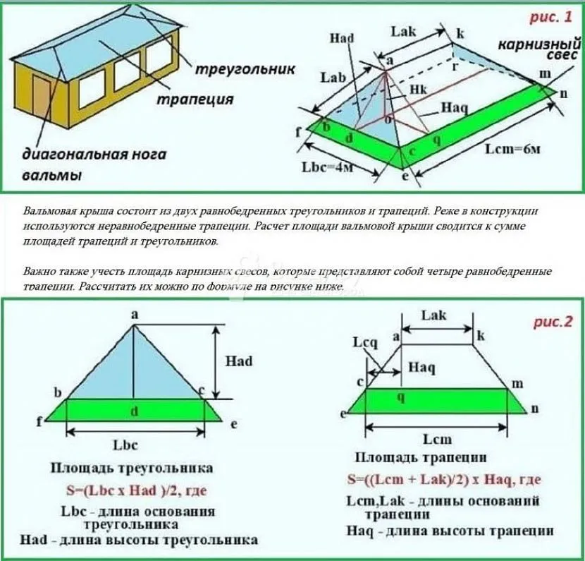 Для расчета площади сторон крыши применяются стандартные геометрические формулы Источник nts-sk.ru