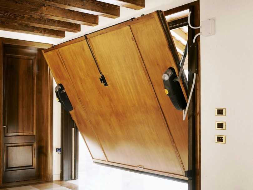 - При открытии верхняя часть откидных ворот отклоняется и на роликах или подшипниках перемещается по двум направляющим до тех пор, пока панель полностью не окажется на двух горизонтальных балках;