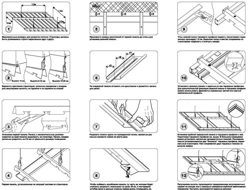 Несмотря на различие в виде и геометрии панелей, общая схема монтажа реечного потолка совпадает по большинству пунктов для разных вариантов конструкций.