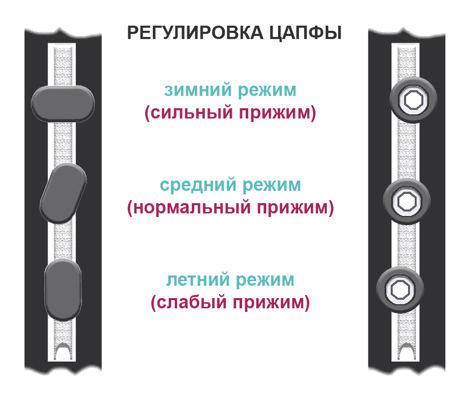 Прежде чем приступить к смене режима, необходимо определить места, в которых находятся устройства для регулировки. В большинстве случаев система предусматривает наличие специальных механизмов – цапф, которые в зависимости от своего положения и определяют необходимую по сезону степень прижатия створки.