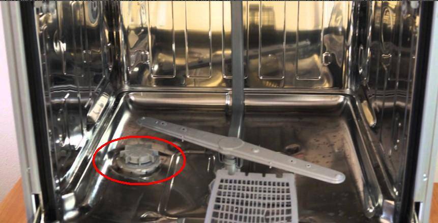На дне камеры для посуды находится фильтр. Нужно его выкрутить и прочистить от загрязнений.