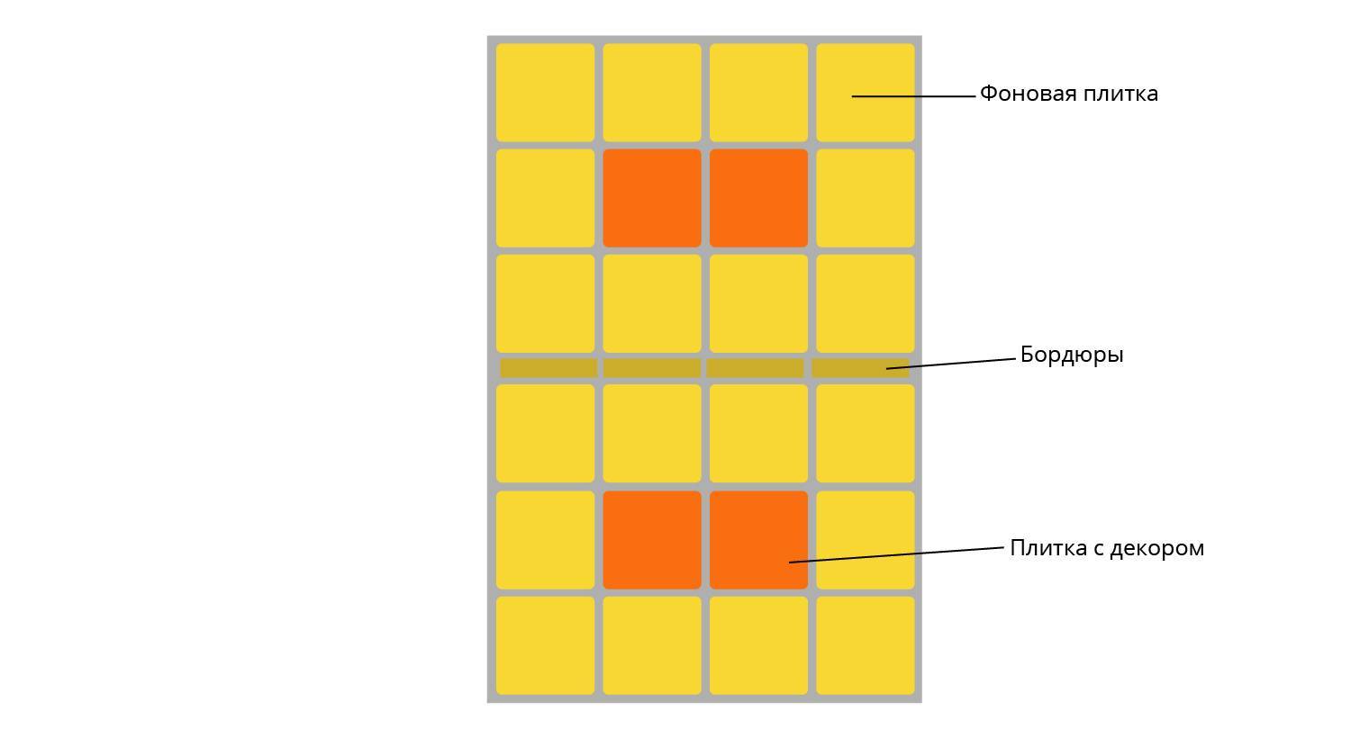 - Бордюры – небольшие элементы, которые разделяют большие цветовые массивы плитки, часто они имеют прямоугольный формат. По возможности резки бордюров можно избежать, если эти элементы не подходят к стенам.