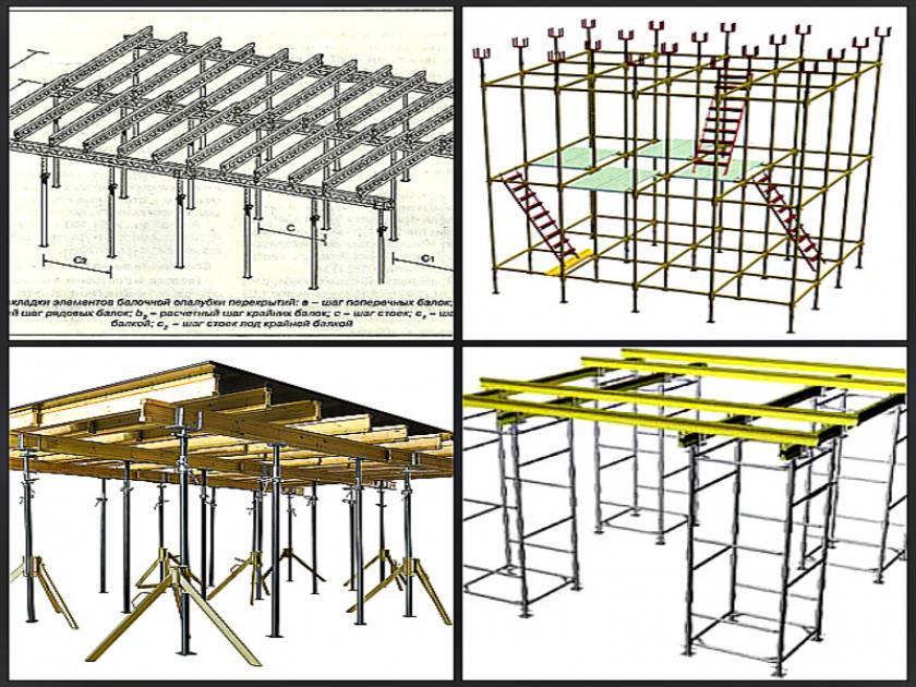 - брусок, бревно либо труба. Их часто применяют застройщики частного сектора, бетонируя перекрытия малоэтажных зданий. Опоры выставляются вертикально, фиксация их выполняется наклонными раскосами;