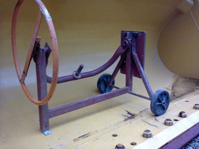Стойка, на которой фиксируется барабан вместе с рукоятью и осью для вращения, должна быть выполнена из сверхпрочного материала. Как правило, в качестве подходящего материала используют металлические трубы, уголки, арматуры и бруски. Иногда применяют доски, но только те, что имеют оптимальные показатели толщины.
