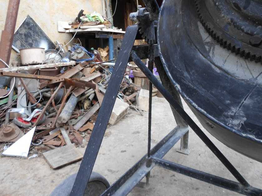 Я не хотел тратить на покупку бетономешалки 12 — 25 тыс. руб. и сделал её сам из разного хлама, бочки и электродвигателя от стиральной машины. Самодельным смесителем для бетона пользуюсь уже не один год. В принципе, всё устраивает. Металл бочки конечно тонковат, но все лечится сваркой. Внутри бочки приварены лопасти для размешивания смеси. Чтобы сделать бетономешалку мне понадобились:
