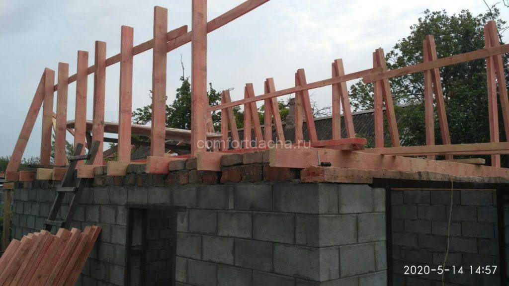 Крыша выполняется по заранее подготовленному основанию. Если она изготовляется из дерева, то на стены накладывается мауэрлат из бруса и стягивается анкерными болтами. Такое укрепление распределяет нагрузку с крыши на стены гаража из пеноблоков. Армопояс под мауэрлат повышает степень надёжности сооружения, поэтому использование желательно, но необязательно.