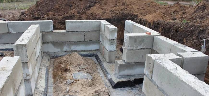 Фундамент сооружают при помощи готовых железобетонных блоков. Их раскладывают на участке, скрепляя между собой цементным раствором. Армирование конструкций применяют, однако делать это необязательно. Сборный фундамент используют преимущественно при строительстве небольших домов (до 5 этажей). По своим несущим качествам он ни в чем не уступает цельнолитому основанию.