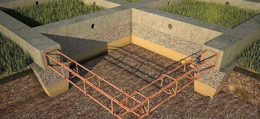 Такой фундамент имеет вид бетонной ленты в форме удлинённого параллелепипеда, армированную металлической или пластиковой конструкцией (обычно это арматурные прутья).