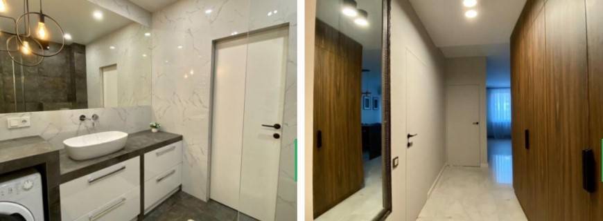 Первое достоинство. Двери скрытого монтажа можно делать практически сливающимися со стеной, т.е. дверями-невидимками. В любой отделке, которая потом не будет вас смущать тем, что не можете подобрать к ней наличник. Например, если зеркальная дверь, то и зеркальное полотно. То в обычной двери сделать красиво зеркальный наличник практически невозможно. Дверь скрытого монтажа наличник не требует.