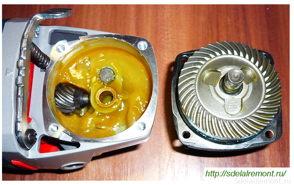 Редуктор УШМ устроен таким образом, что консистентная смазка пары шестерен под воздействием центробежной силы перемещается на стенки корпуса. Признаком «осушения» редуктора является повышенный шум во время работы болгарки. При вскрытии корпуса редуктора проблема становится очевидной. Вся заводская смазка находится на стенках корпуса, косозубые шестерни практически сухие.