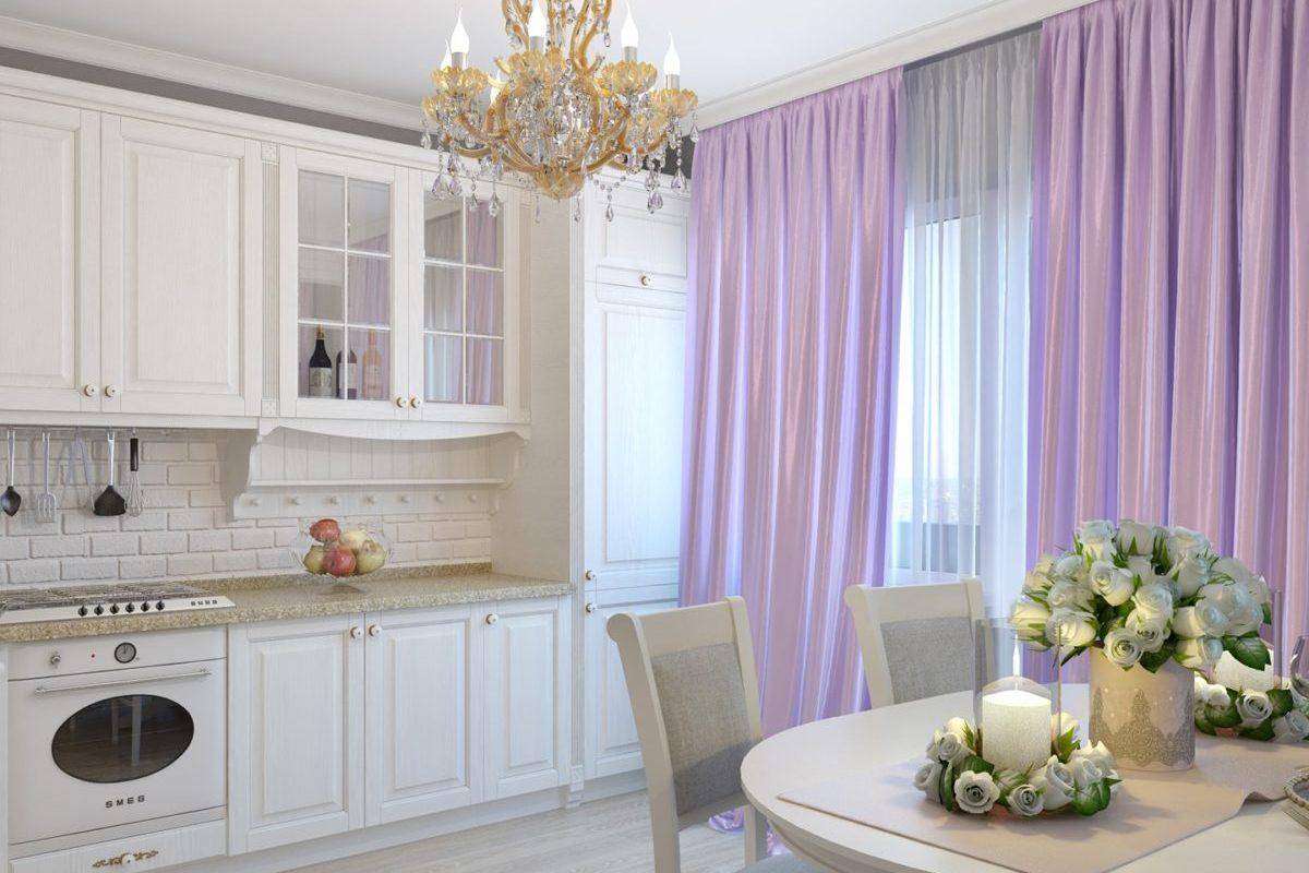 Шторы могут быть как полностью сиреневыми, лавандовыми, так и с рисунком нужного оттенка. В дополнение к ним подбирается подходящая скатерть, коврик, накладки на стулья. Другие варианты – выбрать фиолетовые вазы, цветочные горшки, салфетницы, разделочные доски, любую посуду.