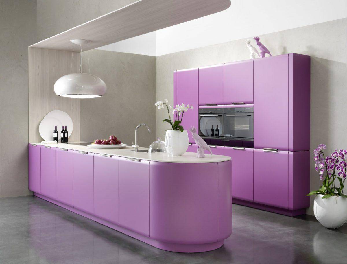 Фиолетовый. Таким оттенком окрашиваются стены в кухнях, где гарнитур и напольное покрытие выглядят намного светлее. Используют материалы с разной фактурой: обои под покраску, декоративную штукатурку, кафель.