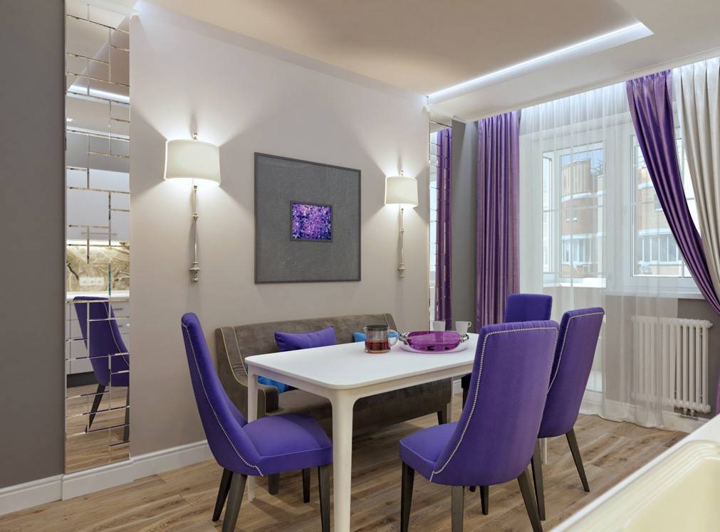 Нужно даже учитывать, на какую сторону выходят окна комнаты. Ведь солнечный свет или его отсутствие способен сильно менять восприятие помещения с преобладанием фиолетового в интерьере.